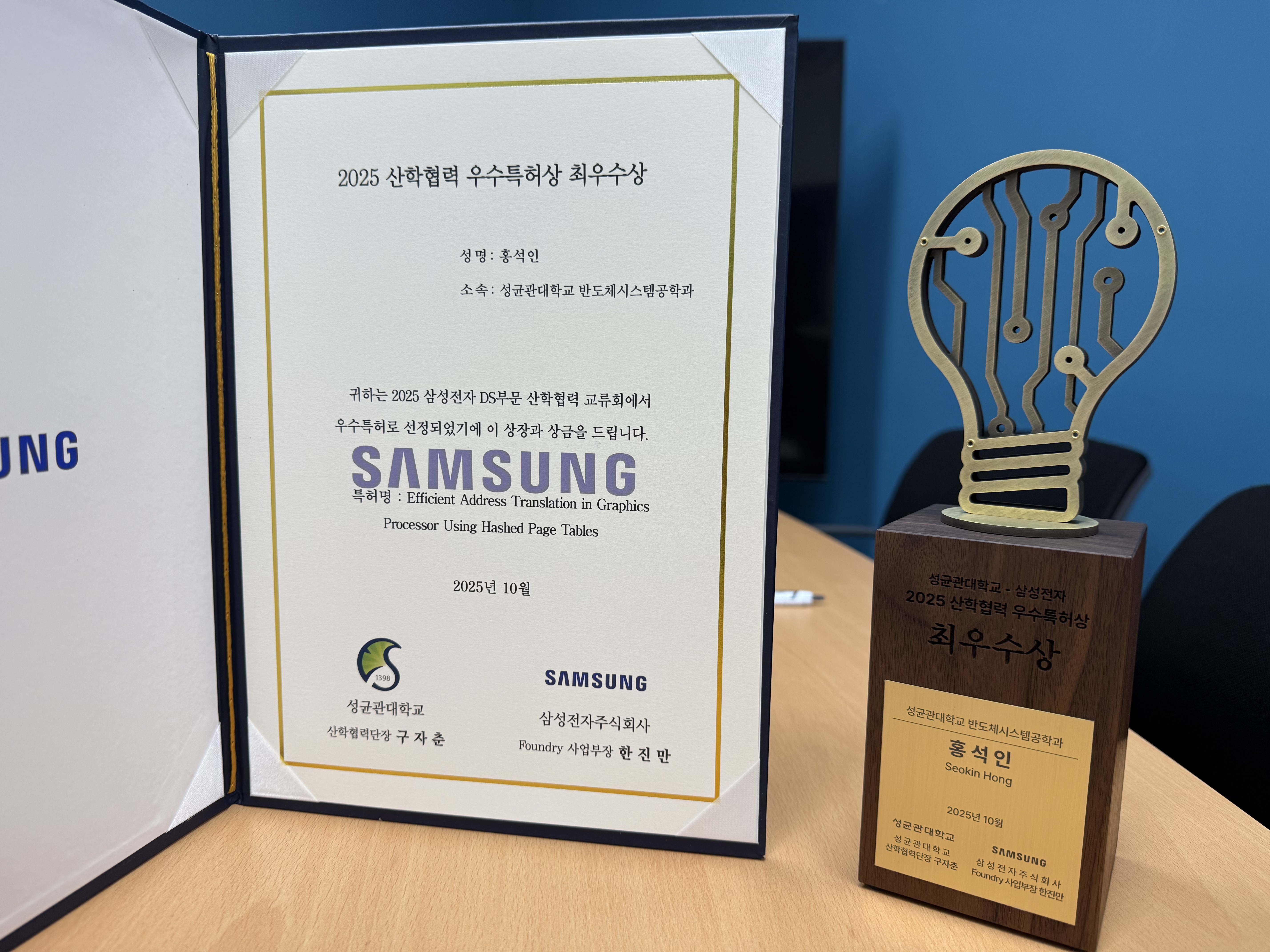 Sungbin’s patent, “Fixed-Size Hashed Page Table for GPU,” has been selected as the Best Industry–Academia Collaboration Patent by Samsung Electronics.